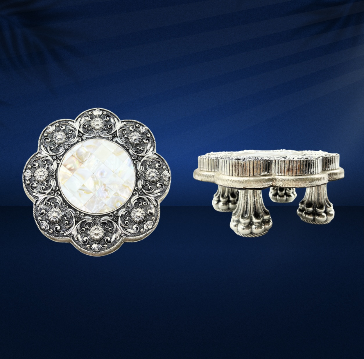 Add a touch of elegance and tradition to your sacred space with this beautifully crafted Round Chowki, made from 999 pure silver. Traditionally used as a decorative platform for placing idols, lamps, or sacred items during prayers and rituals, the chowki symbolizes reverence and devotion. Designed with a smooth round shape and fine craftsmanship, this 8-inch chowki is perfect for home temples, festive décor, and religious ceremonies. The purity and radiant shine of 999 silver enhance its timeless beauty, making it a graceful and meaningful addition to any spiritual setting. ✨🙏