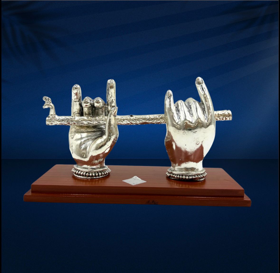 Add a touch of divine artistry to your space with this beautifully crafted Krishna Hand with Flute Idol, made from 999 pure silver. The design elegantly depicts Lord Krishna’s hand holding the sacred flute, symbolizing divine music, peace, and spiritual harmony. Crafted with fine detailing and graceful craftsmanship, this unique piece reflects both devotion and artistic beauty. Measuring 5.5 × 9.5 inches, it is perfect for home temples, living spaces, or as a meaningful spiritual gift. The brilliance of 999 silver adds timeless charm, making it a sacred décor piece that brings serenity and positivity to any setting. ✨🎶🙏